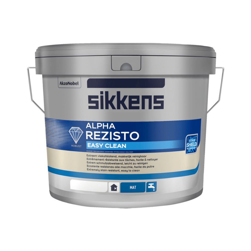 Sikkens Alpha Rezisto Easy Clean Sikkens Alpha Rezisto Easy Clean is een extreem goed te reinigen watergedragen binnenmuurverf. Door de Stain Shield Technologie wordt indringing van vlekken tegen gegaan. Hierdoor is Alpha Rezisto Easy Clean water-, vuil- en vetafstotend en uitermate gemakkelijk te reinigen. De muurverf is geschikt voor het behandelen van alle ondergronden binnenshuis zoals schuurwerk, pleisterwerk, metselwerk, oude intacte verflagen, beton en Fitex-glasweefselsystemen. Rezisto Easy Clean zal niet “opglanzen” na herhaaldelijk reinigen.