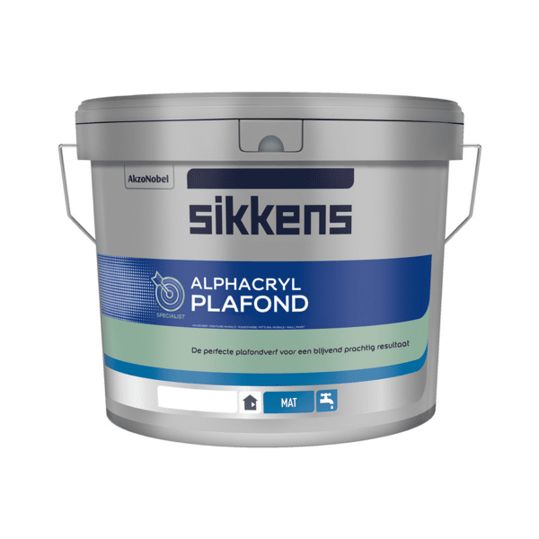 Sikkens Alphacryl Plafond Sikkens Alphacryl Plafond is een waterverdunbare matte muurverf welke uitermate geschikt is voor het schilderen van plafonds. Alphacryl Plafond heeft namelijk een lange open tijd wat zorgt voor een streeploos strak eindresultaat op gladde ondergronden. De matte muurverf voor binnen is gemakkelijk te verwerken, heeft een hoge witheid en is waterdamp doorlatend. Deze Sikkens plafondverf is zeer gemakkelijk te verwerken en zal niet vergelen. Tevens is de matte muurverf zeer goed reinigbaar.