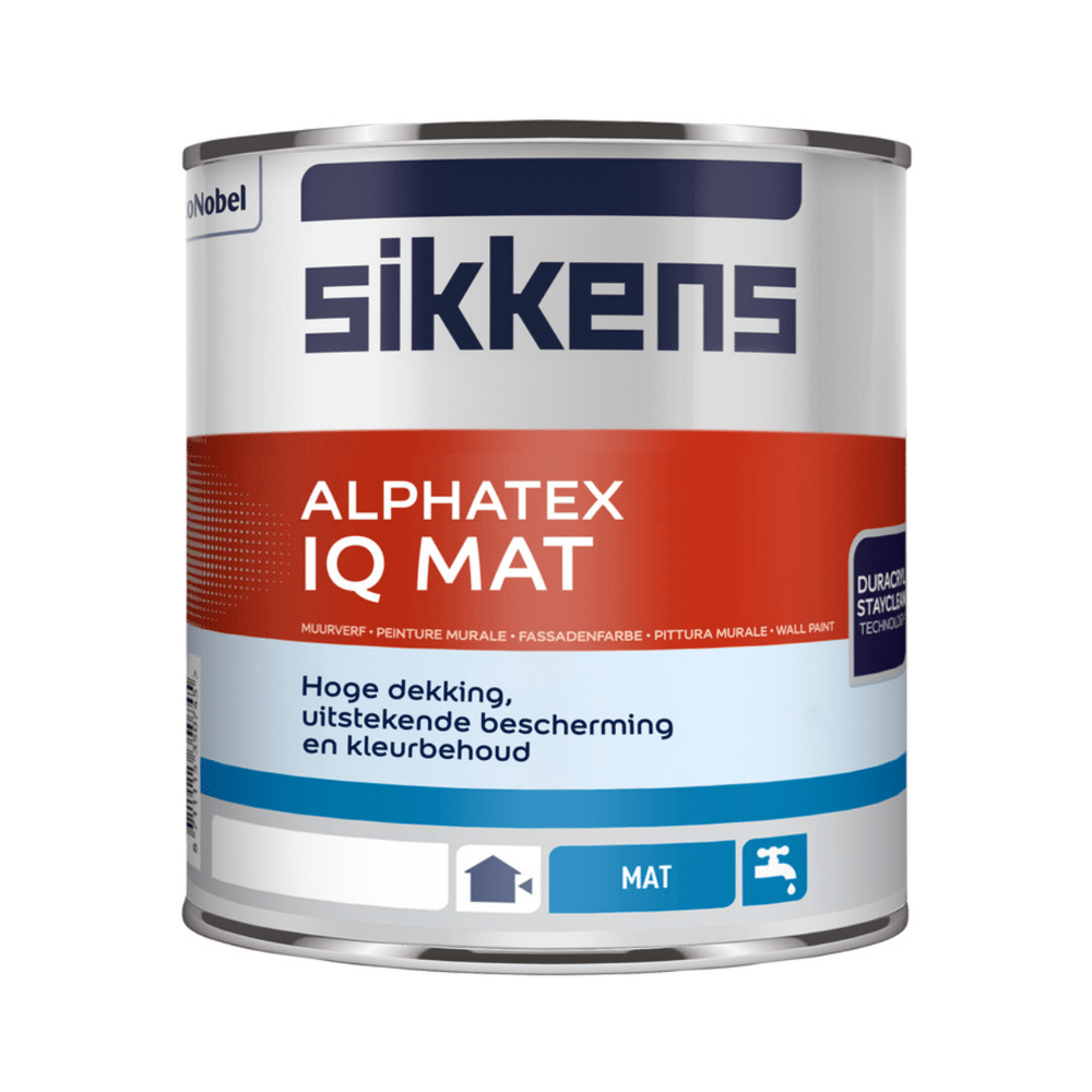 Sikkens Alphatex IQ Sikkens Alphatex IQ Mat is een goed dekkende matte buiten muurverf waarmee jij jouw muren een uitstekende bescherming geeft. Alphatex IQ Mat is weervast en heeft een zeer hoge buiten duurzaamheid waardoor jij jouw buitenmuren een mat uiterlijk geeft. Doordat de muurverf voor buiten een lage vuilaanhankelijkheid heeft is deze zeer goed te reinigen. Doordat de muurverf schrobvast is kan deze ook goed binnenshuis gebruikt worden achter bijvoorbeeld uw kookplaat.