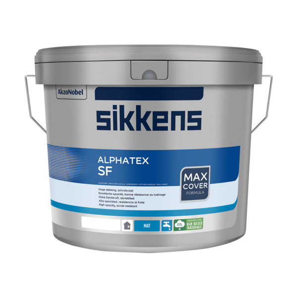 Sikkens Alphatex SF Sikkens Alphatex SF is een schrobvaste watergedragen matte muurverf voor binnenshuis. Alphatex SF is eenvoudig te verwerken en geurarm, u kunt dus de ruimte waarin de muurverf is aangebracht direct weer gebruiken. De matte muurverf voor binnen heeft een uitstekende dekkracht en geeft uw wanden een professionele matte uitstraling. Sikkens Alphatex SF is zeer goed reinigbaar en daarom uitermate geschikt om in keuken aangebracht te worden. Ook kan de muurverf aangebracht worden op Fitex glasweefselbehang.