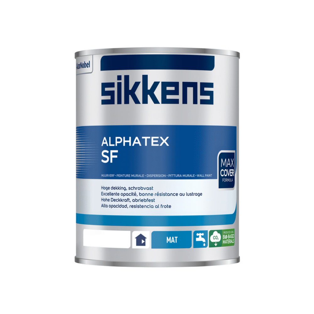 Sikkens Alphatex SF Sikkens Alphatex SF is een schrobvaste watergedragen matte muurverf voor binnenshuis. Alphatex SF is eenvoudig te verwerken en geurarm, u kunt dus de ruimte waarin de muurverf is aangebracht direct weer gebruiken. De matte muurverf voor binnen heeft een uitstekende dekkracht en geeft uw wanden een professionele matte uitstraling. Sikkens Alphatex SF is zeer goed reinigbaar en daarom uitermate geschikt om in keuken aangebracht te worden. Ook kan de muurverf aangebracht worden op Fitex glasweefselbehang.