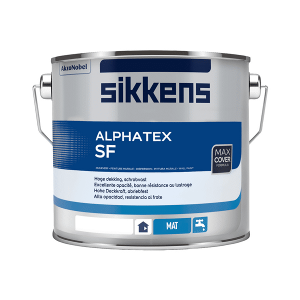 Sikkens Alphatex SF Sikkens Alphatex SF is een schrobvaste watergedragen matte muurverf voor binnenshuis. Alphatex SF is eenvoudig te verwerken en geurarm, u kunt dus de ruimte waarin de muurverf is aangebracht direct weer gebruiken. De matte muurverf voor binnen heeft een uitstekende dekkracht en geeft uw wanden een professionele matte uitstraling. Sikkens Alphatex SF is zeer goed reinigbaar en daarom uitermate geschikt om in keuken aangebracht te worden. Ook kan de muurverf aangebracht worden op Fitex glasweefselbehang.