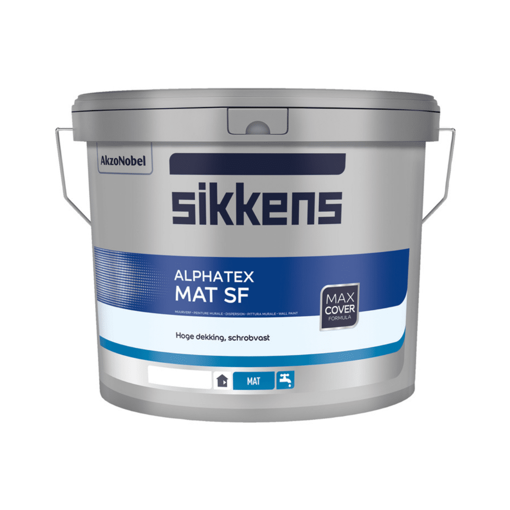 Sikkens Alphatex SF Sikkens Alphatex SF is een schrobvaste watergedragen matte muurverf voor binnenshuis. Alphatex SF is eenvoudig te verwerken en geurarm, u kunt dus de ruimte waarin de muurverf is aangebracht direct weer gebruiken. De matte muurverf voor binnen heeft een uitstekende dekkracht en geeft uw wanden een professionele matte uitstraling. Sikkens Alphatex SF is zeer goed reinigbaar en daarom uitermate geschikt om in keuken aangebracht te worden. Ook kan de muurverf aangebracht worden op Fitex glasweefselbehang.