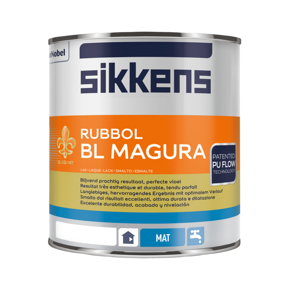 Sikkens Rubbol BL Magura Sikkens Rubbol BL Magura is een watergedragen matte lakverf voor binnenshuis. Deze matte acryllak heeft een unieke combinatie van PU bindmiddelen zorgt voor een perfecte vloei van de verf. Dit zorgt voor een glad en streeploos eindresultaat. Door het gebruik van Rubbol BL Magura van Sikkens geeft u uw deuren en kozijnen dezelfde matte uitstraling als uw wanden. Geschikt voor afwerking van hout, hard PVC, beton, pleisterwerk e.d., na voorbehandeling met Rubbol BL Primer. Ook toepasbaar op oude gereinigde en geschuurde alkydharsverflagen.