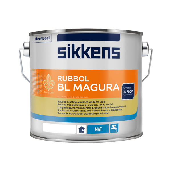 Sikkens Rubbol BL Magura Sikkens Rubbol BL Magura is een watergedragen matte lakverf voor binnenshuis. Deze matte acryllak heeft een unieke combinatie van PU bindmiddelen zorgt voor een perfecte vloei van de verf. Dit zorgt voor een glad en streeploos eindresultaat. Door het gebruik van Rubbol BL Magura van Sikkens geeft u uw deuren en kozijnen dezelfde matte uitstraling als uw wanden. Geschikt voor afwerking van hout, hard PVC, beton, pleisterwerk e.d., na voorbehandeling met Rubbol BL Primer. Ook toepasbaar op oude gereinigde en geschuurde alkydharsverflagen.