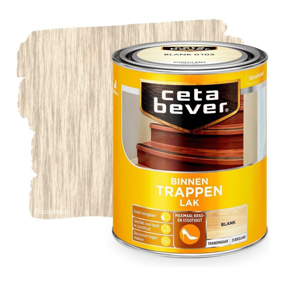 CetaBever Binnen Trappenlak Anti-Slip Blank is een watergedragen lak verkrijgbaar in mat, zijdeglans en zijdeglans anti-slip. Het beschermt en verzorgt uw hout en geeft een prachtige kleurloze eindlaag waarbij de houtnerf zichtbaar blijft.