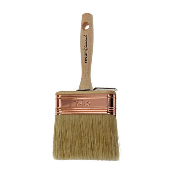 Anza Diamond Blokwitter De Anza Diamond blokwitter is gemaakt van kwalitatief hoogwaardig lang wit Chinees varkenshaar met een rood verkoperde ovale ring. De prettige eigenschap van Chinees varkenshaar is dat de bles tijdens gebruik inslijt en dat daardoor de kwast steeds prettiger gaat schilderen. De blokwitter is daarnaast voorzien van een gemonteerde verniste houten steel. Anza Diamond blokwitter is geschikt voor het verwerken van watergedragen verven als muurverf en voorstrijk op grote oppervlakken zoals wanden en plafonds. Door de emmerhaak, die aan de ovale ring in bevestigd, kun je de kwast aan een emmer of verfbak hangen. Hierdoor kun je rust nemen zonder dat je de blokwitter ergens hoeft neer te leggen.