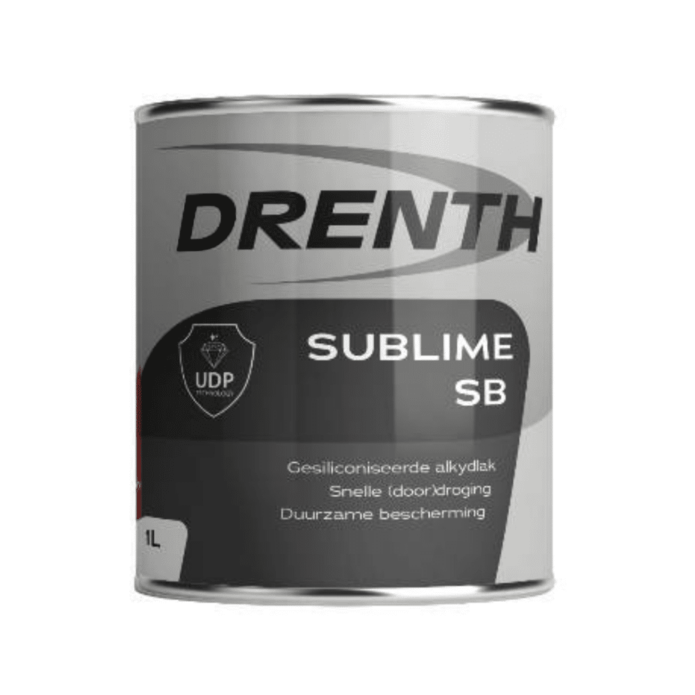 Drenth Sublime SB Drenth Sublime SB is een hoogglans buitenlak met een extreem lange levensduur voor het afwerken van voorbehandelde houten, metalen en kunststof ondergronden.Sublime SB is optimaal inzetbaar op die delen waar hoge eisen worden gesteld aan glansbehoud en levensduur. Zoals kozijnen, ramen en deuren, goten en boeiborden enz.De hoogglans buitenverf met lange levensduur (7-10 jaar!!) is ontwikkelt volgens de nieuwste technieken op het gebied van gesiliconiseerde alkharsen.