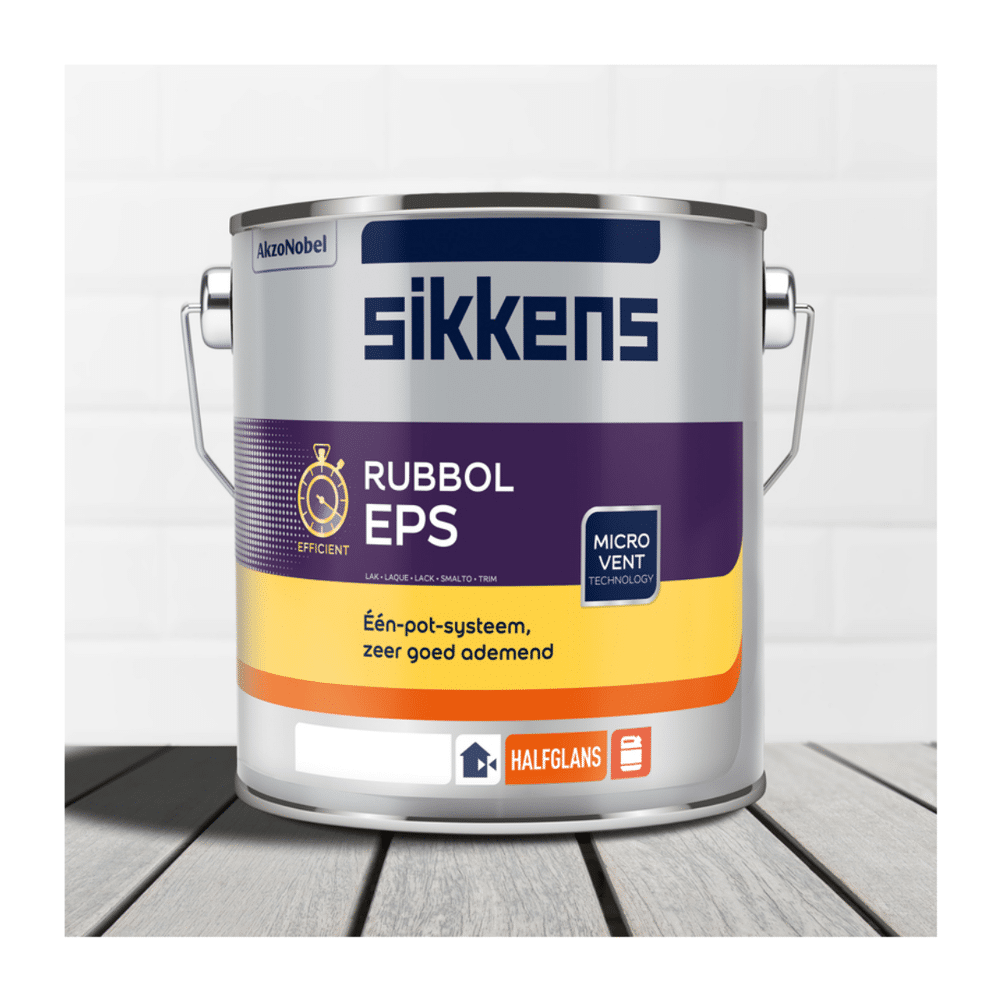 Sikkens Rubbol EPS Sikkens Rubbol EPS is een halfglanzend één-pot-systeem voor gebruik buitenshuis. Deze verf is een grond- en aflak in één pot, dit maakt deze halfglans lak uitermate geschikt om te gebruiken voor uw geveltimmerwerk. Doordat de verf vochtregulerend is, kan de houten ondergrond blijven ademen terwijl door de goede weersvastheid het hout een goede bescherming (4-5 jaar) gegenereerd wordt. Sikkens Rubbol EPS is ook te gebruiken op voorbehandeld (non-ferro) metaal en kunststof.