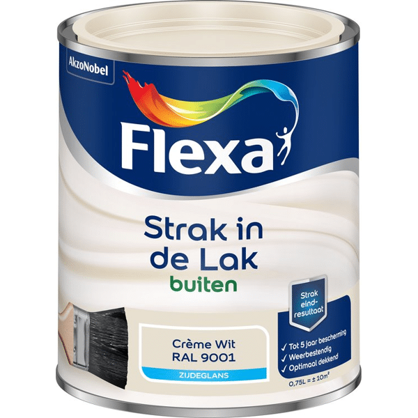 Flexa Strak in de Lak Alkyd Zijdeglans RAL 9001 is een oplosmiddelhoudende zijdeglanslak die zowel binnenshuis als buitenshuis te gebruiken is. De terpentinegedragen zijdeglansverf is extra krasvast, heeft een goede dekking en een uitstekende vloeiing. Deze Flexa lak heeft een buitenduurzaamheid van circa 4 tot 5 jaar bij een voldoende aangebrachte laagdikte. Mede van invloed op de duurzaamheid zijn onder meer de voorbehandeling, de laagdikte en de ligging van het te schilderen object. In donkere ruimtes kan terpentinegedragen verf vergelen. Wij adviseren daarom om binnenshuis watergedragen lakverf te gebruiken. Flexa Strak in de Lak