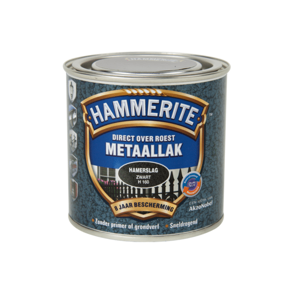 Hammerite Hamerslag Donkerblauw H128 Hammerite Hamerslag Donkerblauw H128 is eendecoratieve roestwerende metaallak met een hamerslageffect.Door middel van de DUALTECH technologie biedt HammeriteMetaallak een dubbele bescherming door een waterafstotende eneen roestwerende laag.Hammerite Hamerslaglak stopt het roestproces en biedt 8 jaarbescherming tegen roest. De metaallakken van Hammerite zijn toepasbaar op allessoorten (roestig en beschadigd) metaal.U kunt deze metaallak direct over roest aanbrengen, hetaanbrengen van een primer is niet nodig.