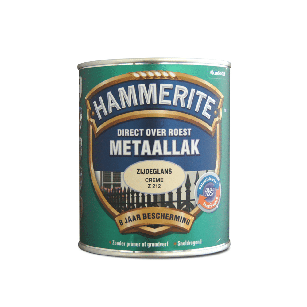 Hammerite Zijdeglans Crème Z212 is een decoratieve, roestwerende metaallak die speciaal is ontwikkeld voor het beschermen en verfraaien van metalen oppervlakken. Dankzij de innovatieve DUALTECH-technologie biedt Hammerite Metaallak een dubbele bescherming: een waterafstotende laag en een roestwerende laag. Hierdoor wordt het metaal langdurig beschermd tegen weersinvloeden en corrosie. De Hammerite zijdeglanslak stopt het roestproces en biedt tot wel 8 jaar bescherming tegen roest. Deze metaallak is geschikt voor alle soorten metaal, ook wanneer het oppervlak al roestig of beschadigd is. Een groot voordeel is dat deze lak direct over roest kan worden aangebracht. Het gebruik van een primer is niet nodig, waardoor u sneller en eenvoudiger aan de slag kunt. Hammerite Zijdeglans Crème Z212