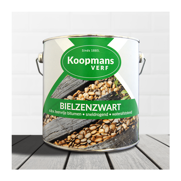 Waarmee bescherm je hout dat je langdurig met de grond in aanraking laat komen tegen doorrotten? Dan is dit de oplossing: Koopmans Bielzenzwart is een beschermingsproduct op basis van teervrije bitumen voor het snel en eenvoudig afwerken van diverse materialen. Een veelzijdig toe te passen product voor diverse houten objecten in de tuin. • - Op basis van teervrije bitumen • - Snel drogend • - Waterafstotend • - Gifvrij, brand niet op de huid of planten