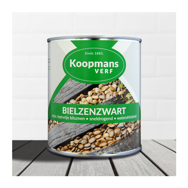 Waarmee bescherm je hout dat je langdurig met de grond in aanraking laat komen tegen doorrotten? Dan is dit de oplossing: Koopmans Bielzenzwart is een beschermingsproduct op basis van teervrije bitumen voor het snel en eenvoudig afwerken van diverse materialen. Een veelzijdig toe te passen product voor diverse houten objecten in de tuin. • - Op basis van teervrije bitumen • - Snel drogend • - Waterafstotend • - Gifvrij, brand niet op de huid of planten