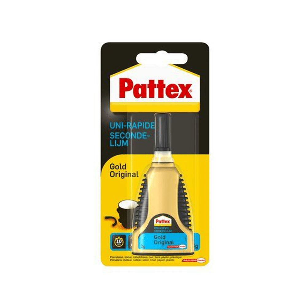 Repareer Snel en Sterk met Pattex Gold Original Secondelijm Heb je iets dat snel en sterk gerepareerd moet worden? Pattex Gold Original Secondelijm is jouw oplossing voor bijna alle huishoudelijke reparaties. Deze krachtige lijm werkt op de meeste materialen, van kunststoffen en keramiek tot hout en metaal. Het bijzondere? Het is supersterk en droogt razendsnel, binnen 10 tot 30 seconden, waardoor je reparaties in no-time gedaan zijn. Perfecte Precisie Met het unieke doseersysteem van Pattex Gold Original Secondelijm kun je de lijm nauwkeurig aanbrengen, zelfs op de moeilijkste plekjes. Geen geknoei, alleen een perfecte toepassing elke keer weer. En omdat het transparant opdroogt, zie je bijna niet dat er iets gerepareerd is. Ideaal voor Binnen Of je nu een gebroken vaasje moet lijmen of een losse schoenzool, deze secondelijm is ideaal voor alle klusjes in huis. Het is veilig in gebruik en geschikt voor een breed scala aan materialen, waardoor het je go-to lijm wordt voor alles. Maak je geen zorgen meer over kapotte spullen in huis. Met Pattex Gold Original Secondelijm zijn je reparaties snel, sterk en bijna onzichtbaar. Probeer het nu en zie het verschil. Eigenschappen Type: Secondelijm Kant-en-klaar: Ja Materiaal doeloppervlak: Universeel Toepassingsgebied: Binnen Kleur: Transparant Overschilderbaar: Nee Inhoud: 3 gram EAN: 5410091608767