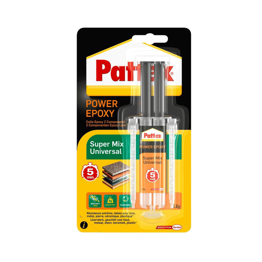 Maak Sterke Verbindingen met Pattex Super Mix Universal Zoek je een krachtige lijm die bijna alles aankan? Pattex Super Mix Universal is jouw oplossing. Deze epoxylijm is perfect voor lastige reparaties waar je een sterke, duurzame verbinding nodig hebt. Of je nu porselein, glas, metaal of hout wilt lijmen, deze lijm doet het werk. Het mooie? Het droogt transparant op en is bestand tegen water, olie, en de meeste oplosmiddelen. Vult en Repareert Met zijn geweldige vullend vermogen, maakt Pattex Super Mix Universal het makkelijk om oneffenheden weg te werken. Dit betekent dat je niet alleen lijmt, maar ook repareert en versterkt, allemaal met één product. Gebruiksvriendelijk en Betrouwbaar De tweecomponentenmix zorgt voor een snelle en gemakkelijke applicatie. Met de handige mengspuit meng je de lijm automatisch in de juiste verhouding. Je hebt 4 minuten om je materialen te lijmen, en binnen 24 uur is de verbinding op volle sterkte. En geen zorgen over het weer; deze lijm kan binnen en buiten gebruikt worden, van vrieskou tot zomerhitte. Voor reparaties die echt moeten houden, vertrouw op Pattex Super Mix Universal. Het is de alleskunner onder de lijmen die je helpt bij elk project, groot of klein. Eigenschappen Type: Universele lijm Kant-en-klaar: Nee Materiaal doeloppervlak: Universeel Toepassingsgebied: Binnen Kleur: Transparant Overschilderbaar: Nee Inhoud: 11 ml EAN: 3178040682184